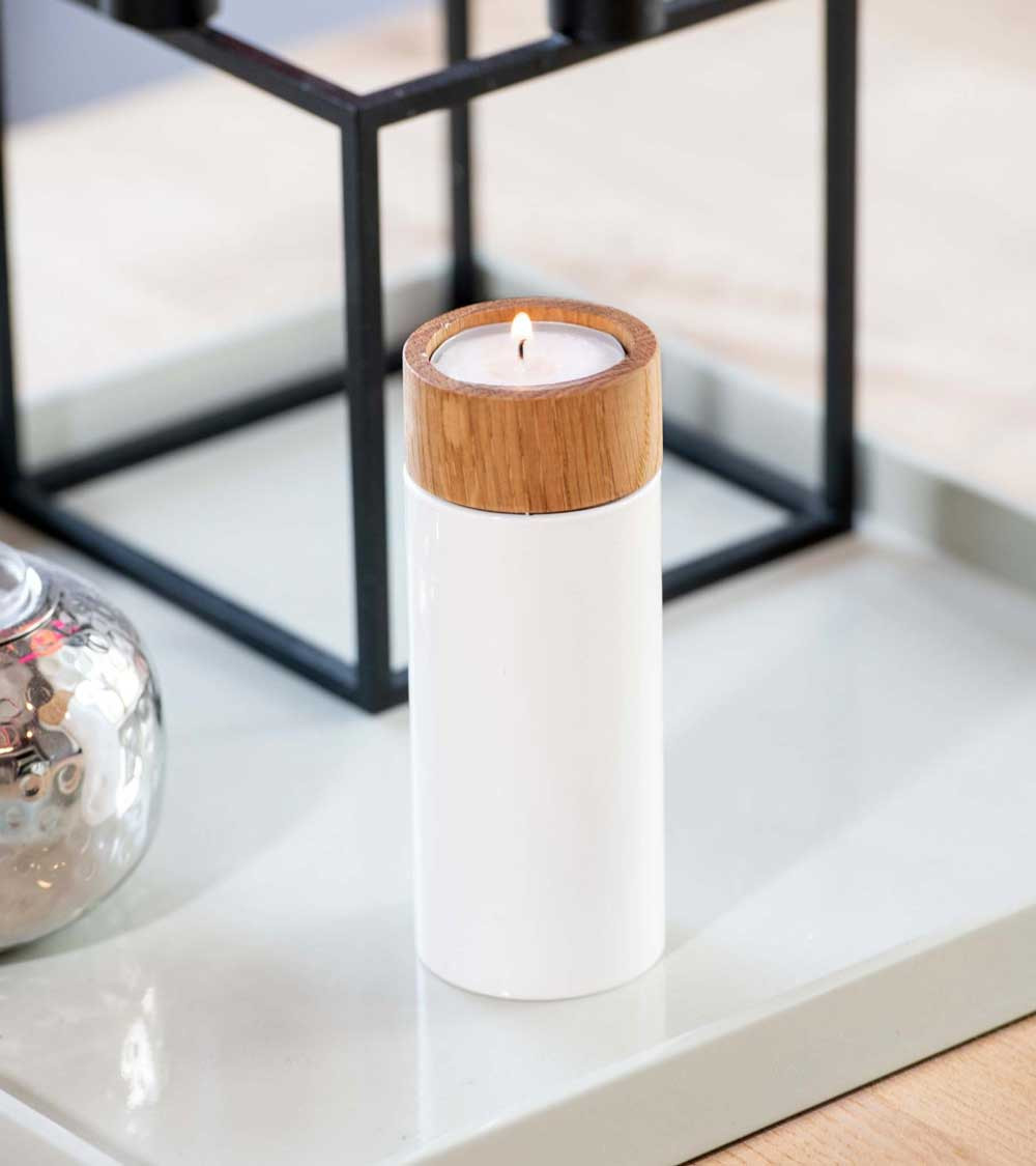 La particularité : ce bougeoir moderne se compose de 2 parties. Une partie supérieure en bois de chêne huilé avec un manchon métallique fixe dans lequel s'insère une bougie chauffe-plat (fonctionne également avec les bougies chauffe-plat durables sans manchons métalliques) et une base en aluminium thermolaqué, dans laquelle il y a de la place pour stocker des bougies chauffe-plat de rechange.