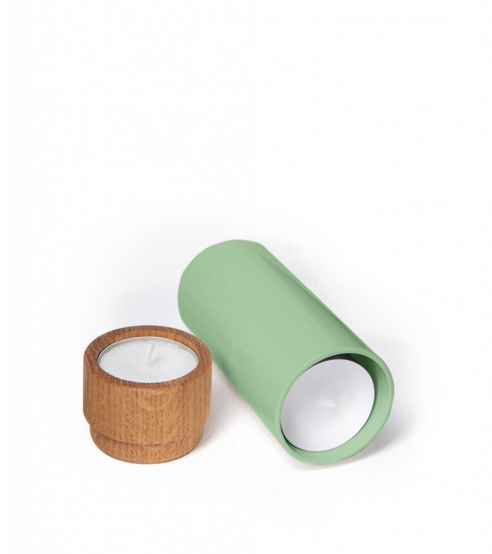 AKKU, le porte-bougie cylindrique en bois de chêne huilé avec un manchon en métal et une base en métal vert pâle avec un compartiment pour les bougies de remplacement !