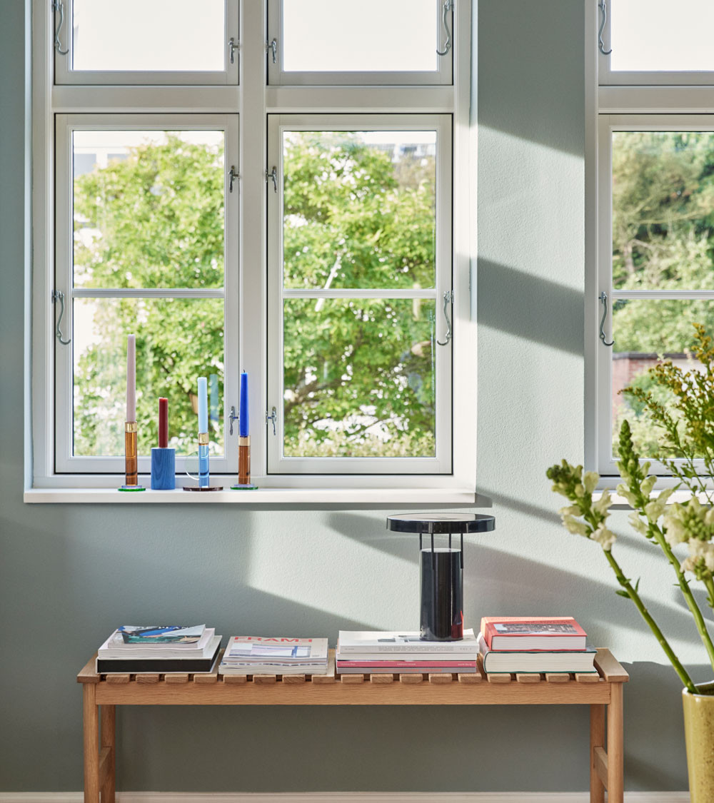Le bougeoir avec anse Astro est un objet de décoration design qui attire le regard grâce à sa forme géométrique simple et ses couleurs audacieuses.
