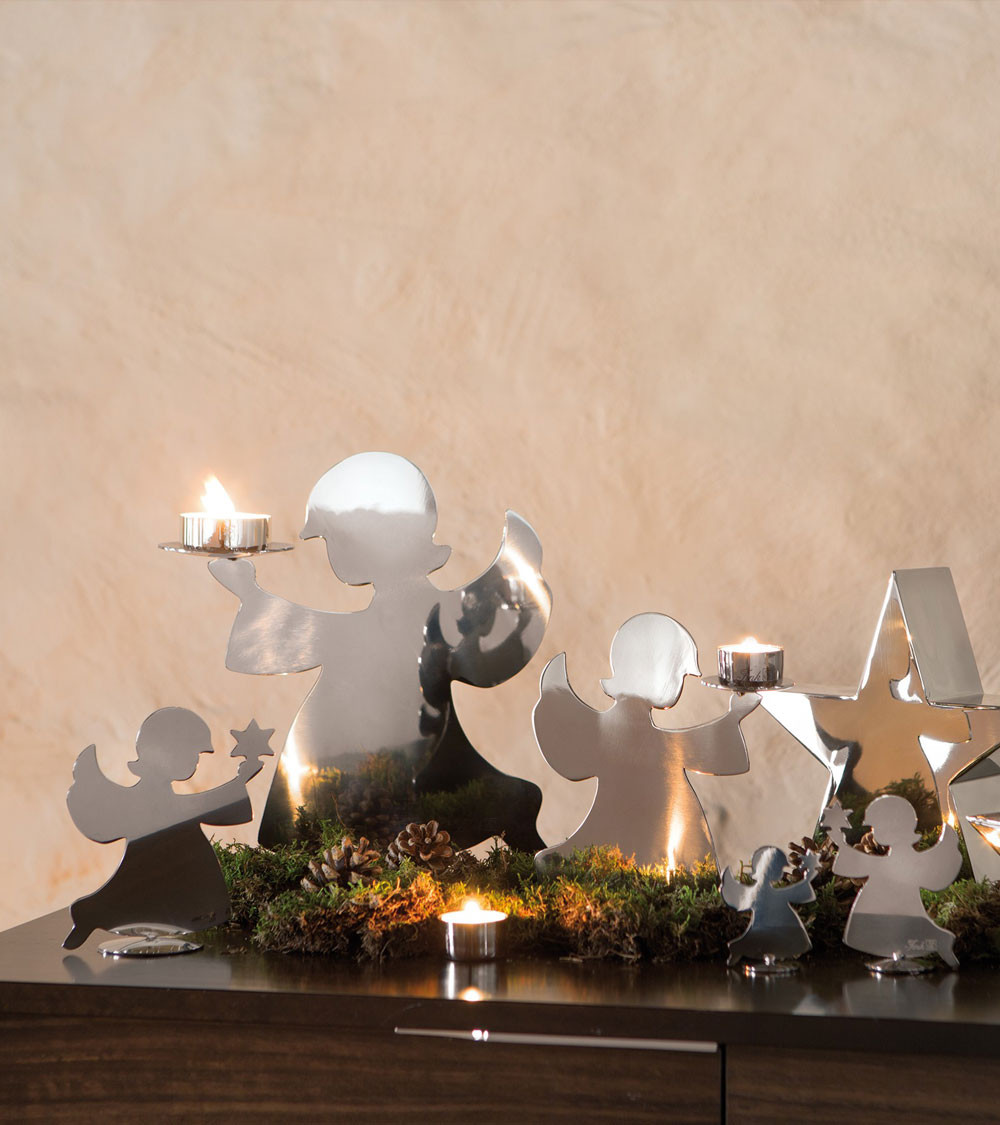 On peut difficilement imaginer une décoration de l'Avent sans les anges. Proclamant la Bonne Nouvelle, ils nous rappellent l'histoire de Noël et incarnent la charité et la cordialité. Laissez ces messagers célestes s'installer dans votre maison. Avec ces figurines et ces bougeoirs de haute qualité, vous créerez en un rien de temps de magnifiques compositions qui attireront tous les regards sur votre décoration de Noël. La surface en acier inoxydable des figurines d'anges reflète les lumières et les couleurs de l'environnement et s'intègre aussi bien dans les styles décoratifs modernes que classiques. Que ce soit en tant qu'accent d'ambiance sur la table de fête ou en tant qu'accroche-regard extraordinaire sur un buffet, une étagère ou un rebord de fenêtre : Avec ces éléments décoratifs au design exclusif de Fink, les fêtes de fin d'année seront d'une beauté céleste.