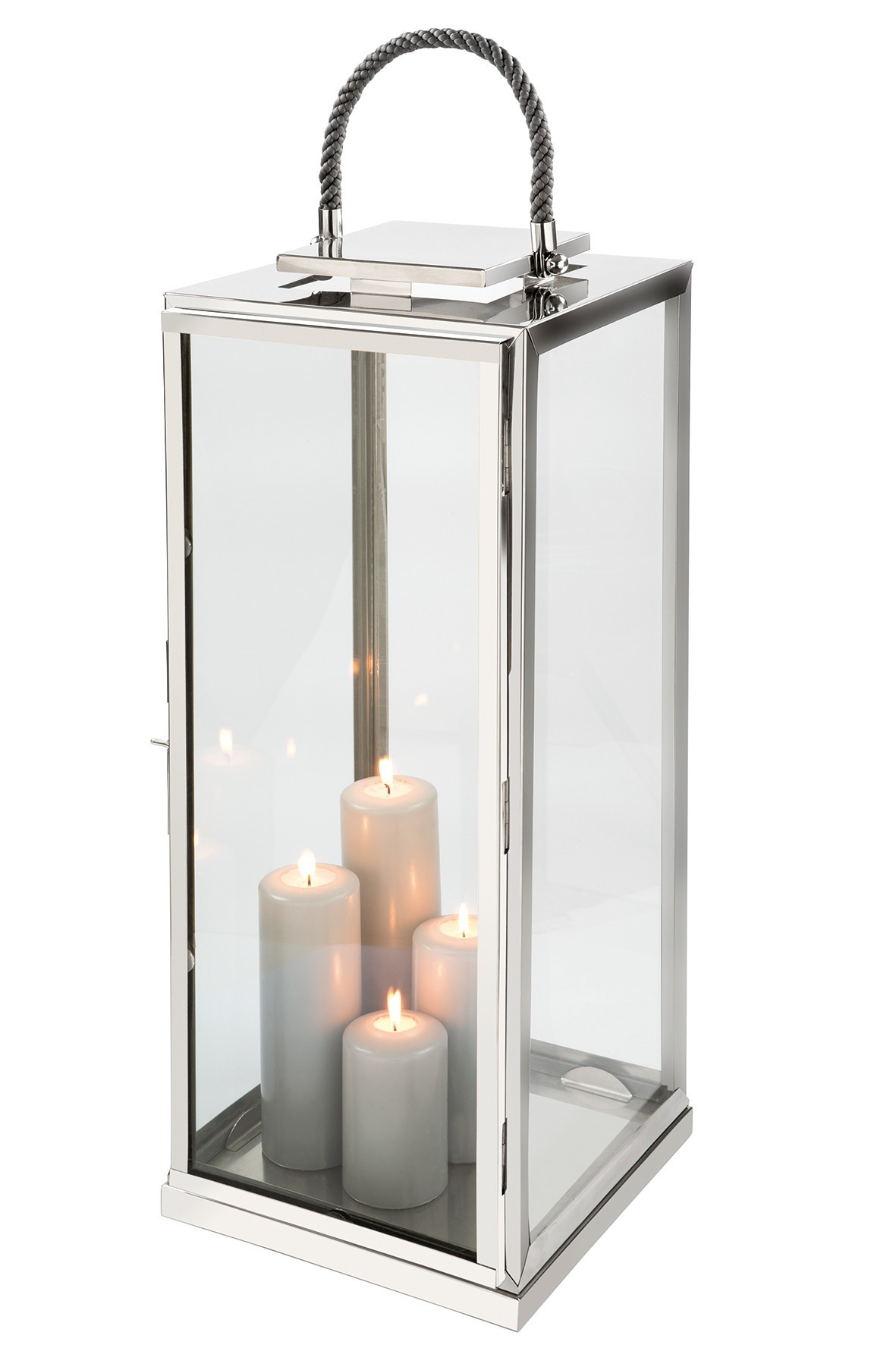 La lanterne SEVILLA de Fink Living, avec son design en acier inoxydable brillant et verre transparent, est idéale pour créer une ambiance lumineuse et élégante.
