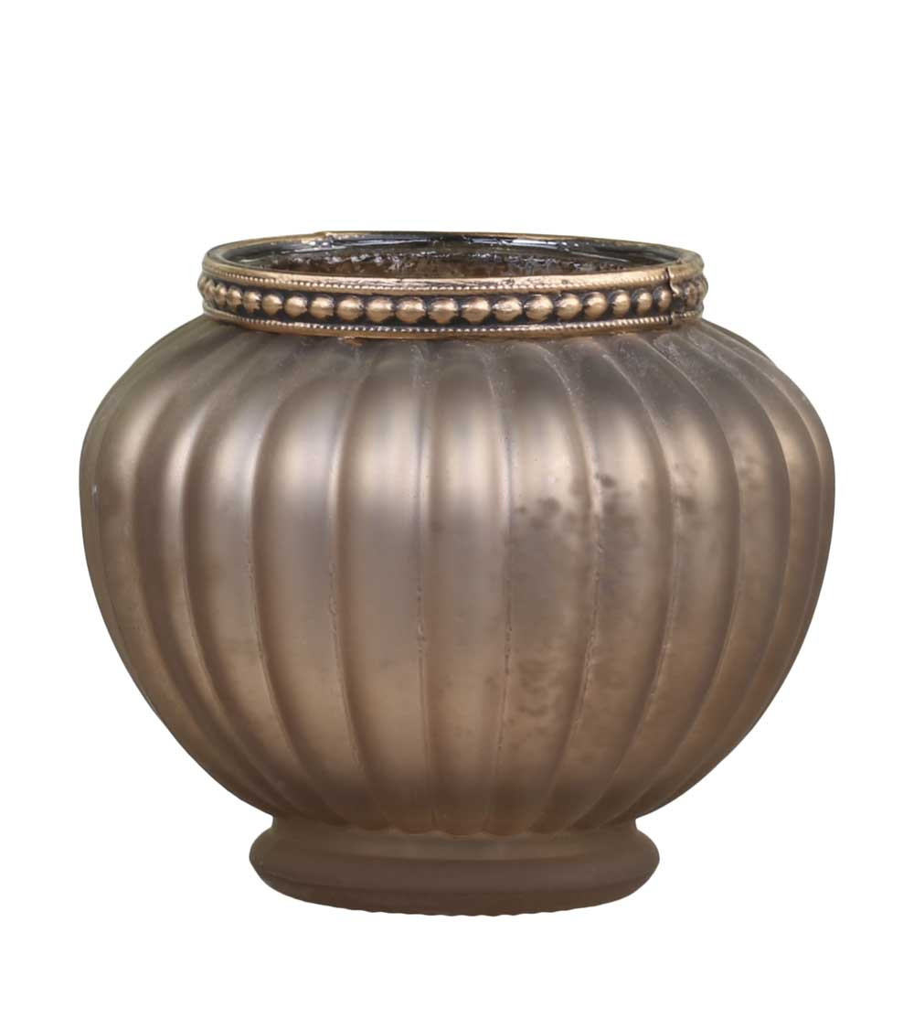 Le photophore avec bord de perles antique mocha est l'accessoire incontournable pour créer une ambiance chaleureuse et élégante dans votre maison. Fabriqué avec soin, ce photophore allie un verre de haute qualité à un design intemporel, qui se distingue par ses rainures délicates et son bord décoratif en perles dorées. Ce détail subtil apporte une note sophistiquée qui rehausse l'éclat de la lumière diffusée.