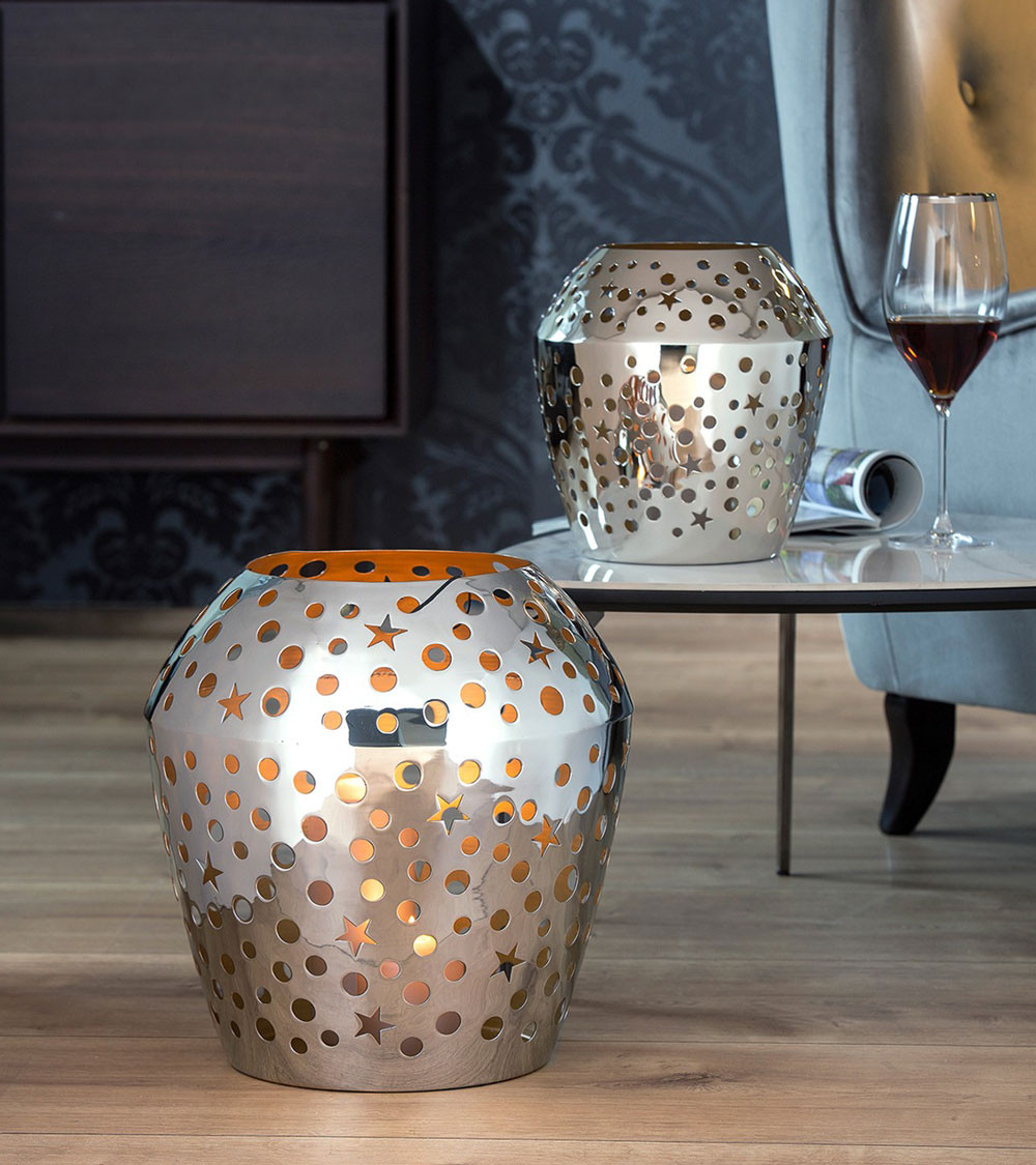 Illuminez vos soirées avec le photophore Sheila H 24 cm, une pièce élégante qui allie brillance argentée et chaleur dorée. Fabriqué à la main, ce photophore en métal nickelé séduit par son design ajouré, orné de découpes circulaires et étoilées qui projettent de magnifiques jeux de lumière. Son revêtement intérieur doré reflète la flamme et diffuse une lueur chaleureuse, idéale pour créer une atmosphère cosy et raffinée. Parfait pour vos décorations d’hiver, de Noël ou de l’Avent, il s’adapte aussi à vos ambiances tout au long de l’année. Associé à la seconde taille disponible, il devient un véritable atout déco, moderne et intemporel.